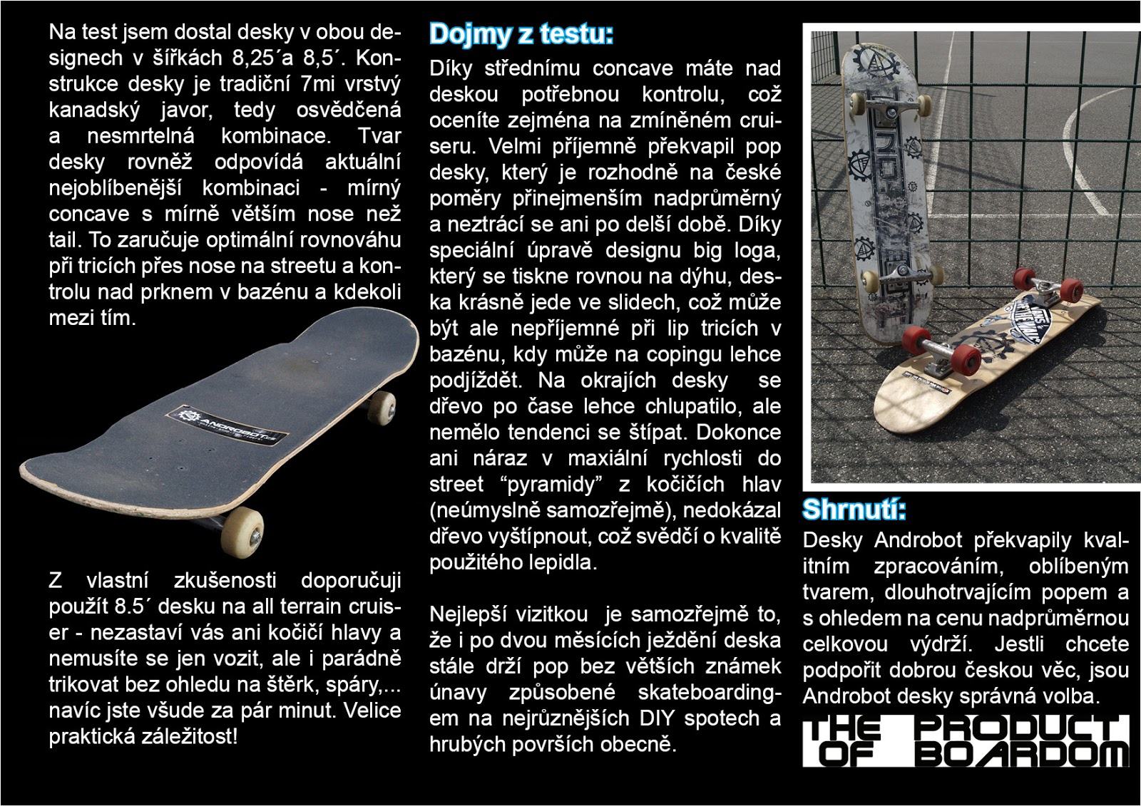 Fakt, že Češi jsou schopní sami vyrábět skate desky, hodně promluvil do situace na trhu – jak pozitivně díky dobré kvalitě zpracování a příznivé ceně, tak i negativně kvůli neschopnosti ostatních firem vyrovnat se s novou konkurencí. Poslední značkou, která se rozhodla vstoupit na domácí trh, je skateshop Androbot. Jak jejich deska vypadá a co vydrží?