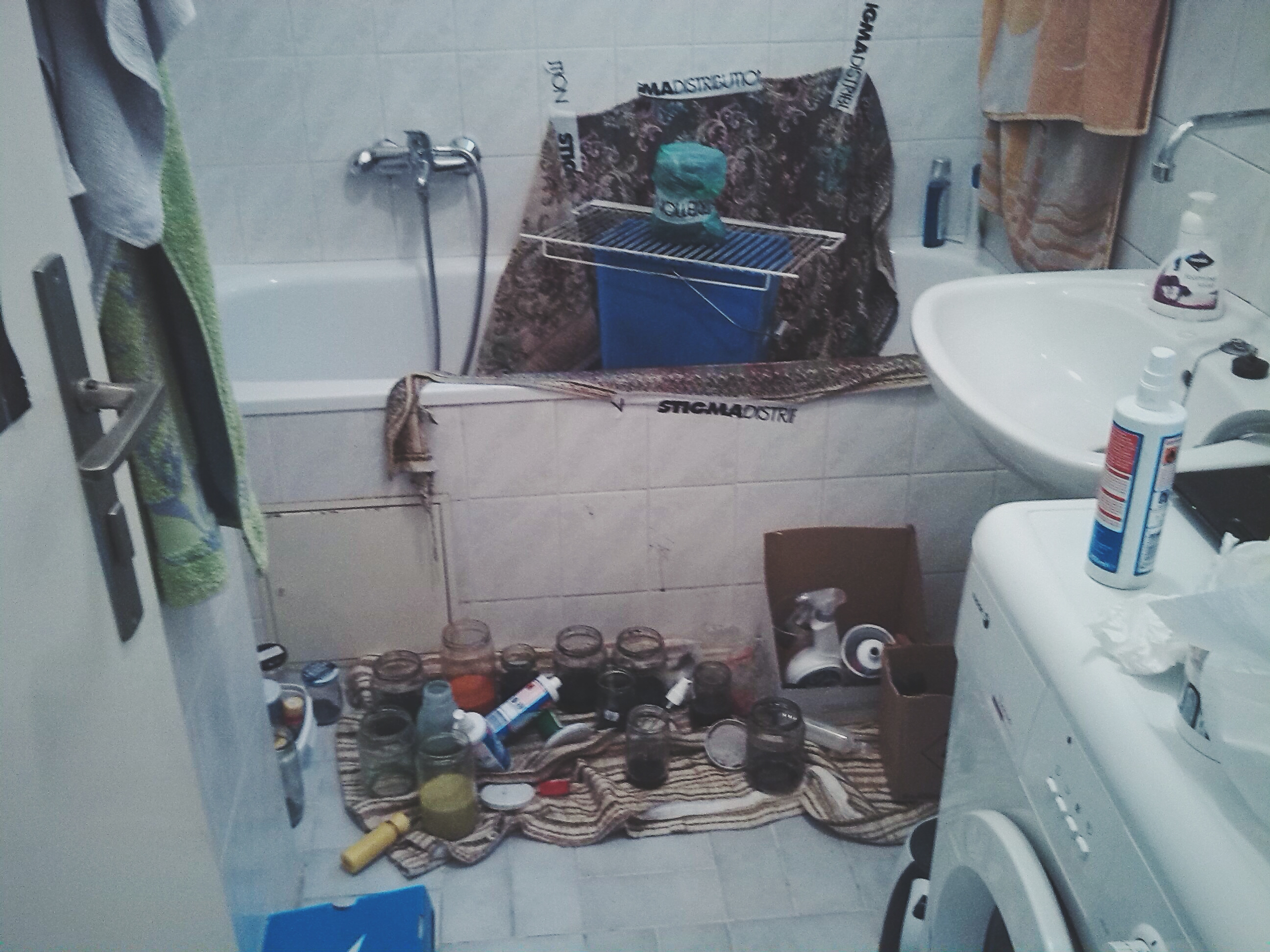 Skate desky – ručně malba, kresba, fix, spreje, pastely. Fonty se snažim dělat ručně. Batika všeho doma v koupelně. Tisk oblečení nechávám dělat na zakázku, ale hledám si no name věci různě po netu a v obchodech (se sítotiskem jsem maturoval, ale k tomu nemám bohužel už přístup). Na závěsné obrazy a kresby používám kombinace více technik.