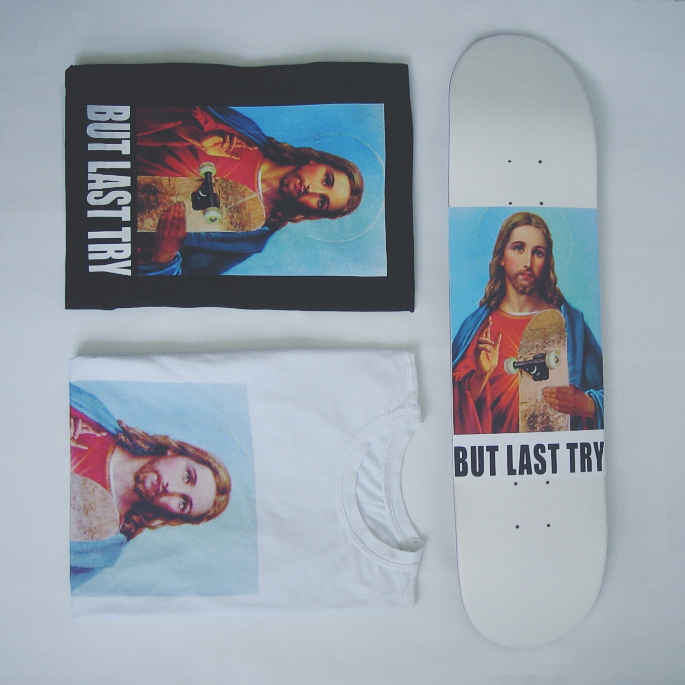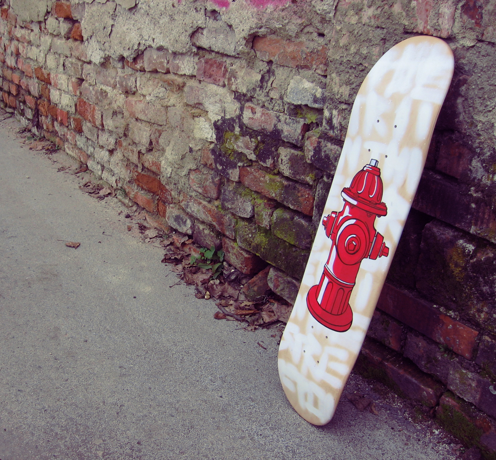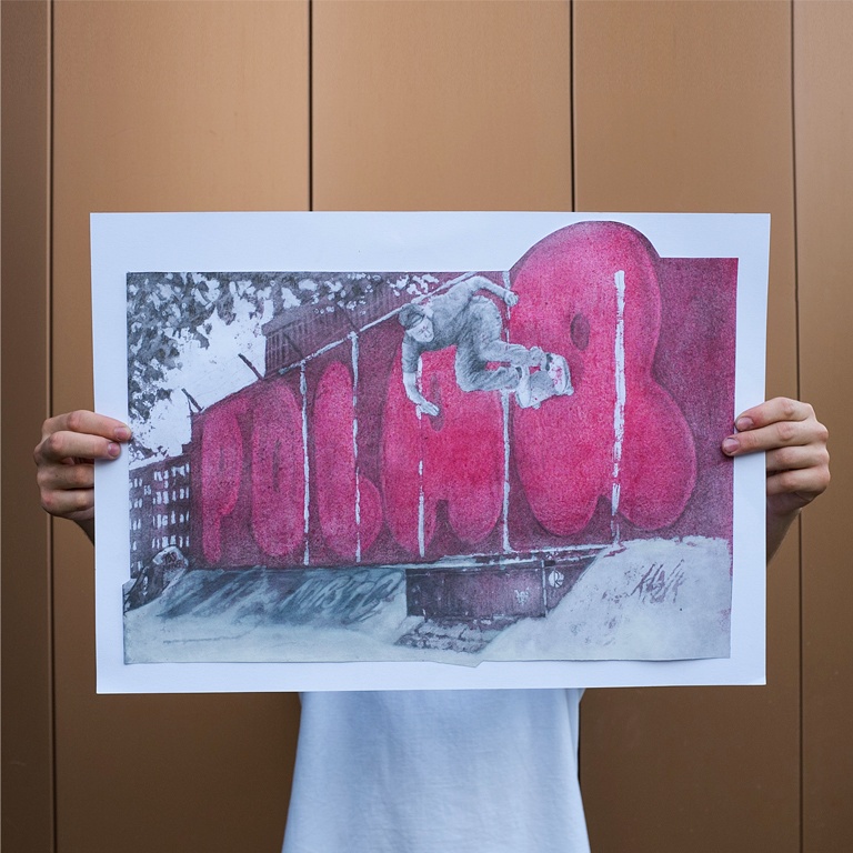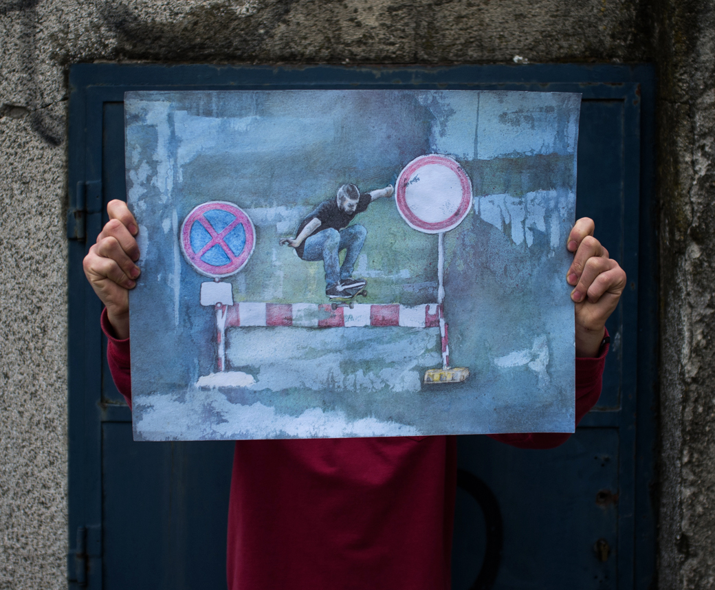 Poprvé jsem viděl tu originální fotku, kterou jsem předělal na plenéru v Tatrách na Horské chatě v září 2011 a prvotní forma byla naprosto jiná. Z toho nakonec sešlo, ale pořád jsem ten obraz měl v hlavě. Při jedné cestě vlakem nad tím tak přemýšlím a BUM, mám to! Dám mu do ruky skate! To je přesně ta scéna, co nastává při každým „jednom pokusu, který je ale fakt už poslední“ a je jedno, zda jsi jezdec, fotograf nebo sekuriták. Ten, kdo to zažil, tak přesně ví, oč tu běží. Doma jsem hned googlil, zda-li to už někdo neudělal a nikde nic. Měl jsem zelenou, ale dlouho jsem čekal na příležitost tisknou za přijatelnou cenu, ta se naskytla až v září 2013. Posílám pět každému, kdo už má svůj kus doma.