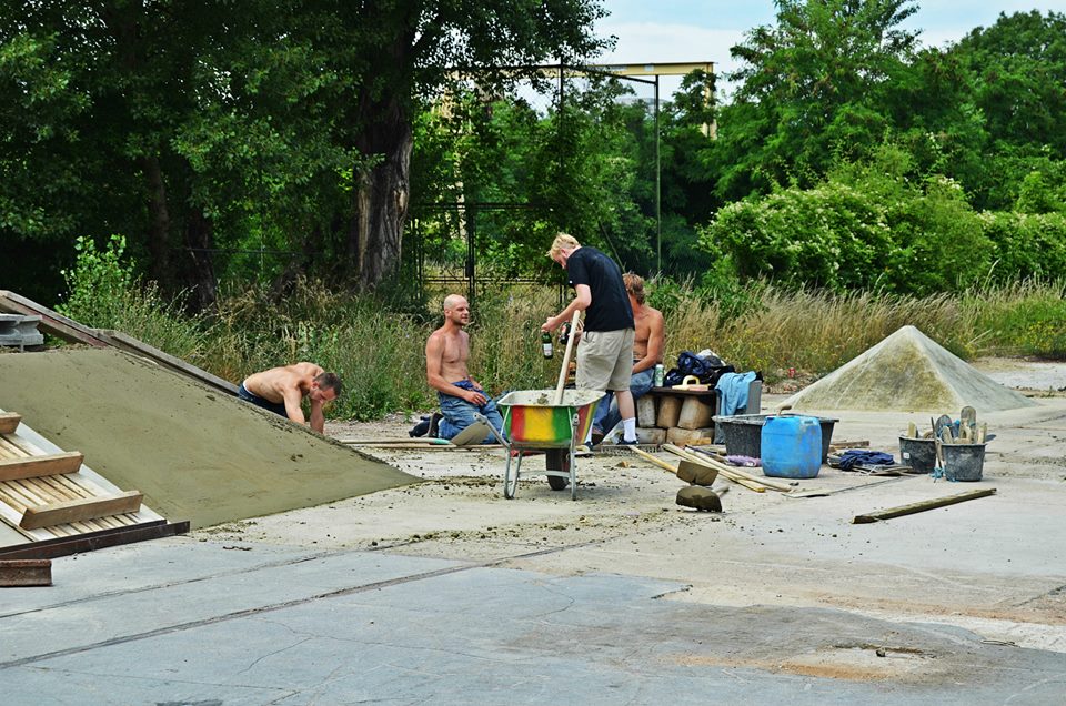 Jsme na místě- v první (streetové sekci – tak bych to nazval já ) vyrostly dvě nové překážky – centrál s plošinkou + bazénová kapsa. Po union buňkách,kde kluci měli vše potřebné ke stavbě se slehl popel. Taky beton na většině míst už