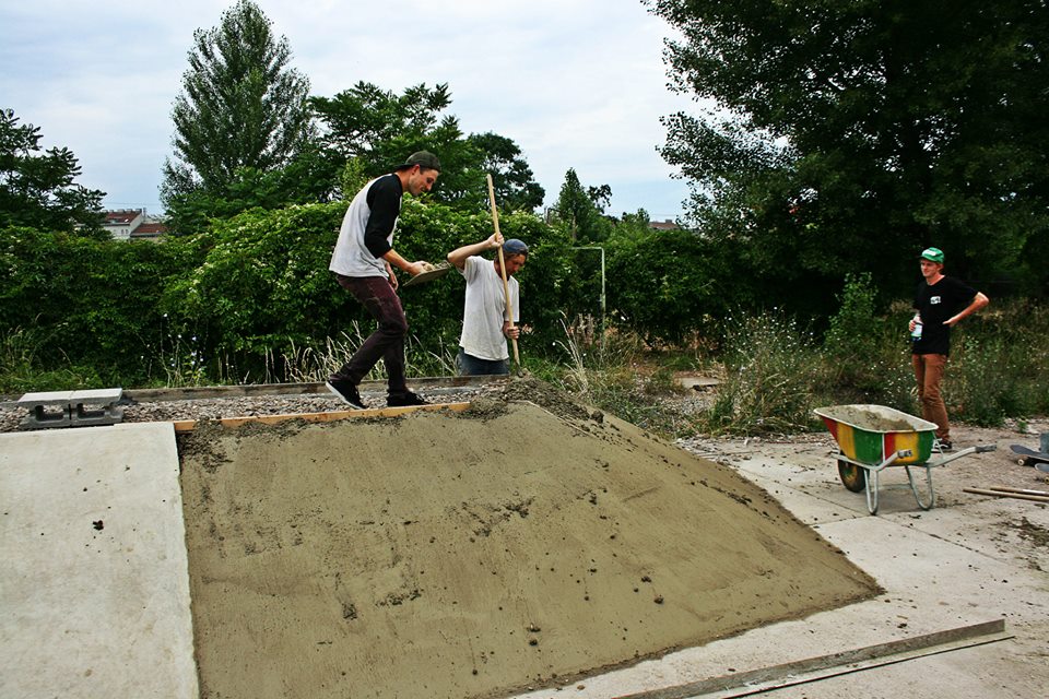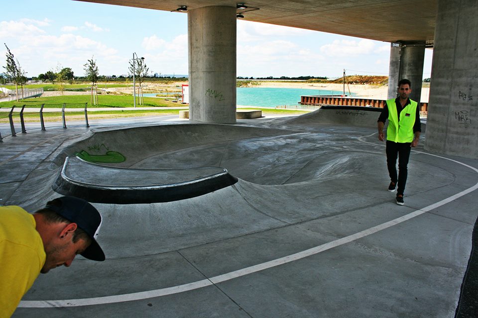 Plán na ráno je jasnej- vstáváme už v 8:00, bombíme hotelovou snídani do plných, každej dvě kávy a navigace prvně luští Rakouské názvy ulic. V 10:00 už stojíme na nově vybudovaném spotu jménem ALM. Z poza křoví jde slyšet blaholibý zvuk míchačky, na místě jsou pouze dva lokálové – jeden obstarává míchačku a naváží směs, druhej dohlazuje právě rozestavěnej corner. Kluci nás vítají s úsměvem a slovy – „let´s skate- it´s yours!“