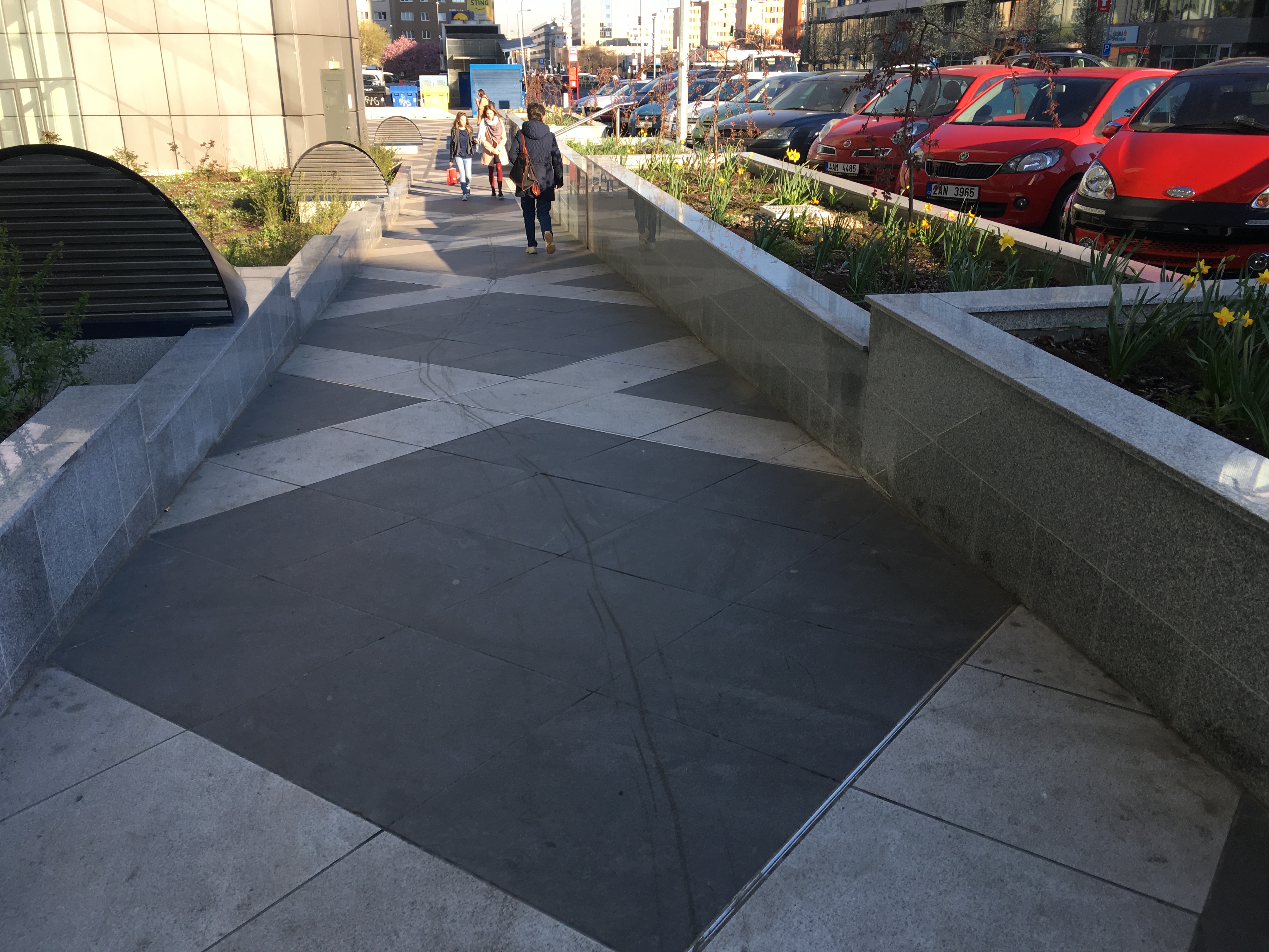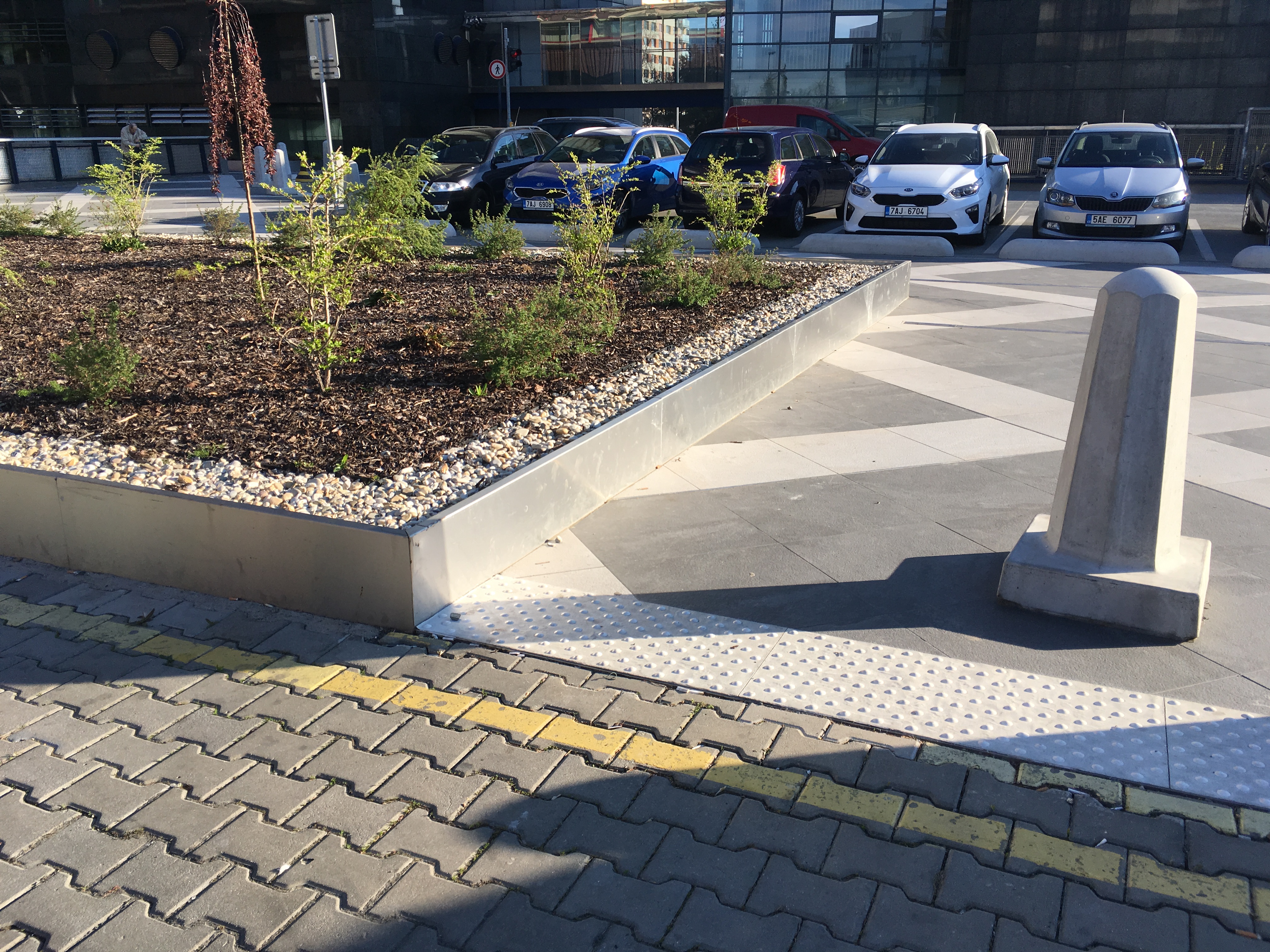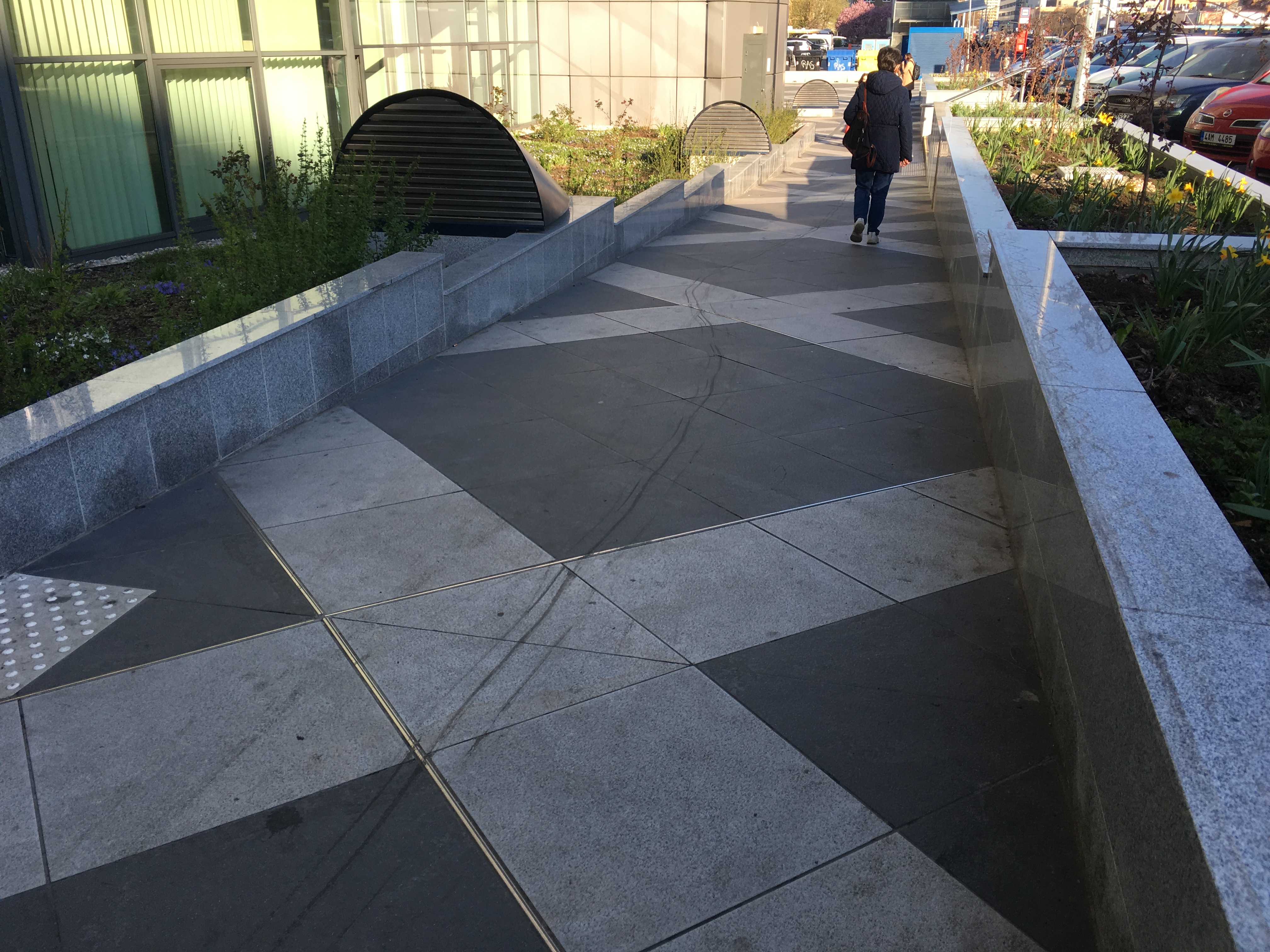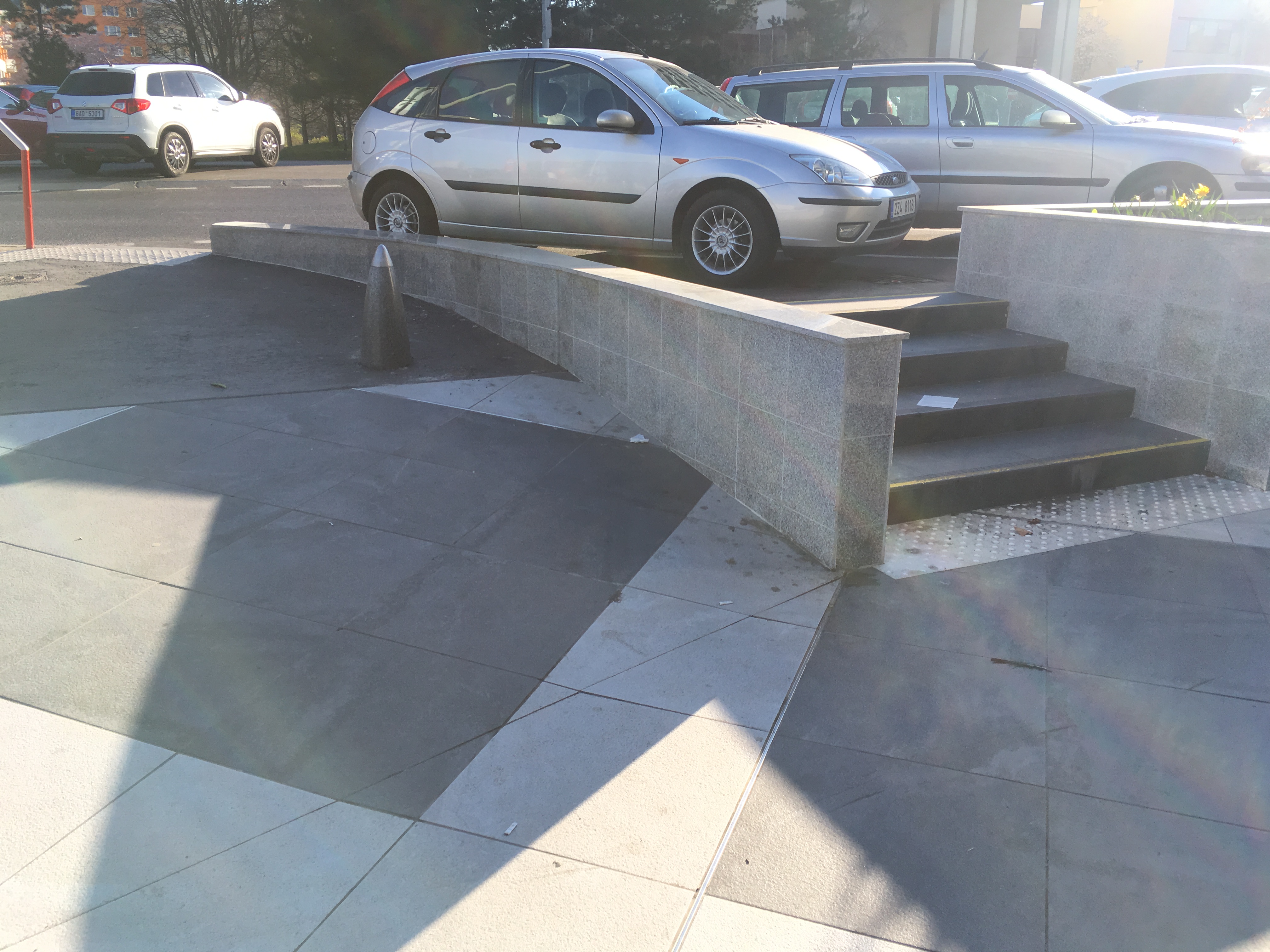 Před budovou směrem k hlavní silnici je stupňovitá mramorová zídka z obou stran a za budovou na parkovišti více než parádní parking curby a železné květináče. Prý se zatím nevyhazuje, navoskováno je…
