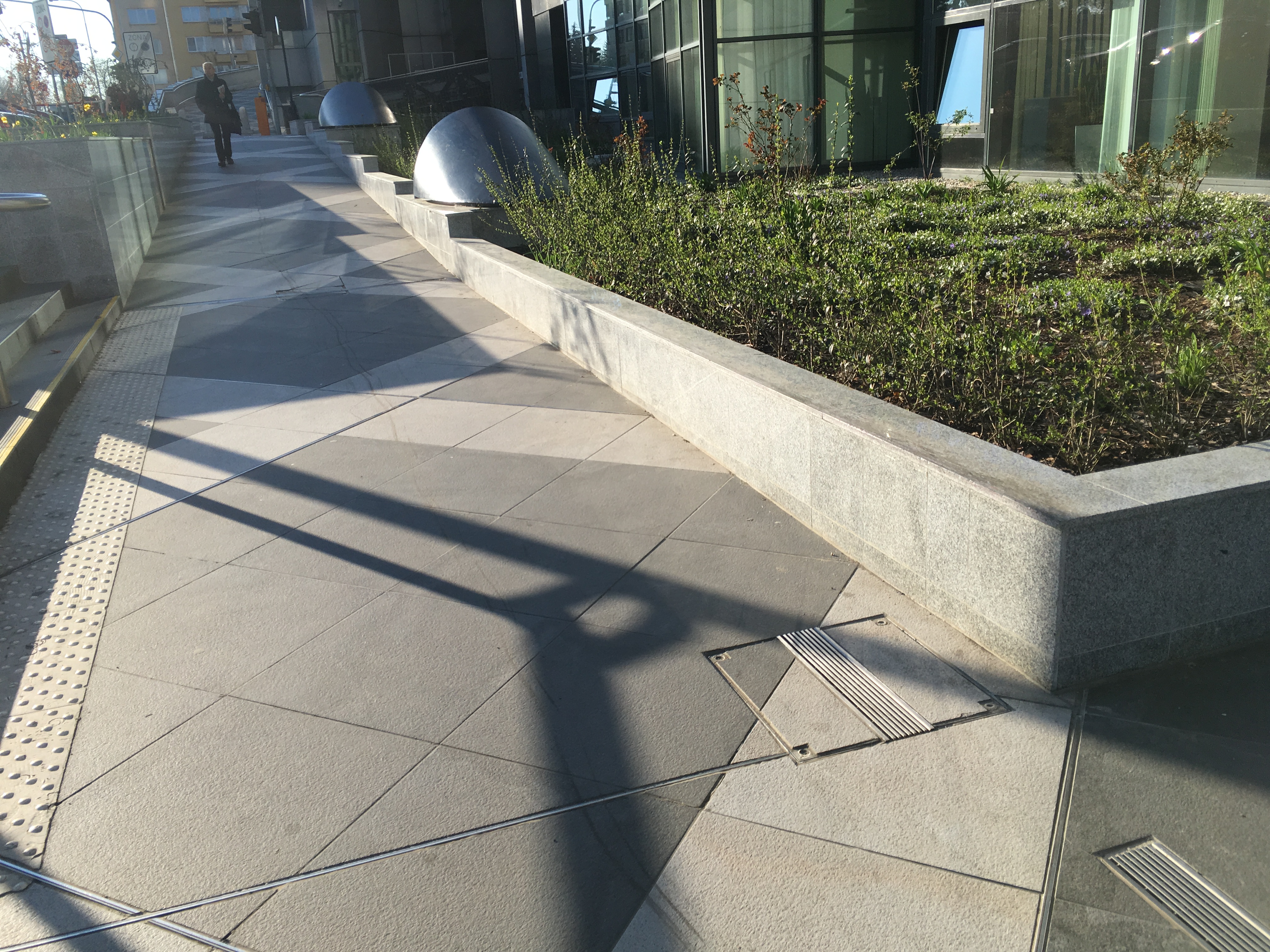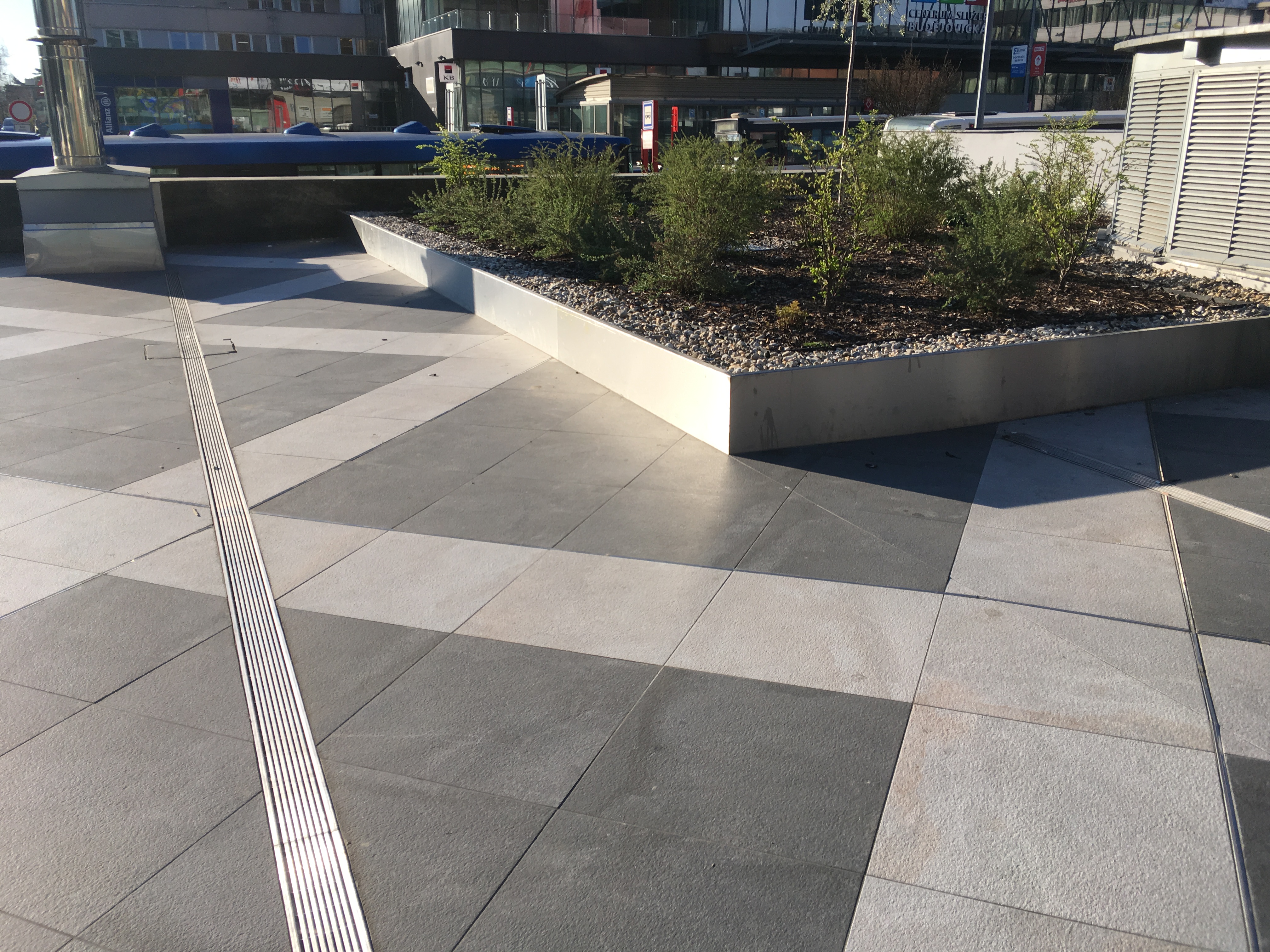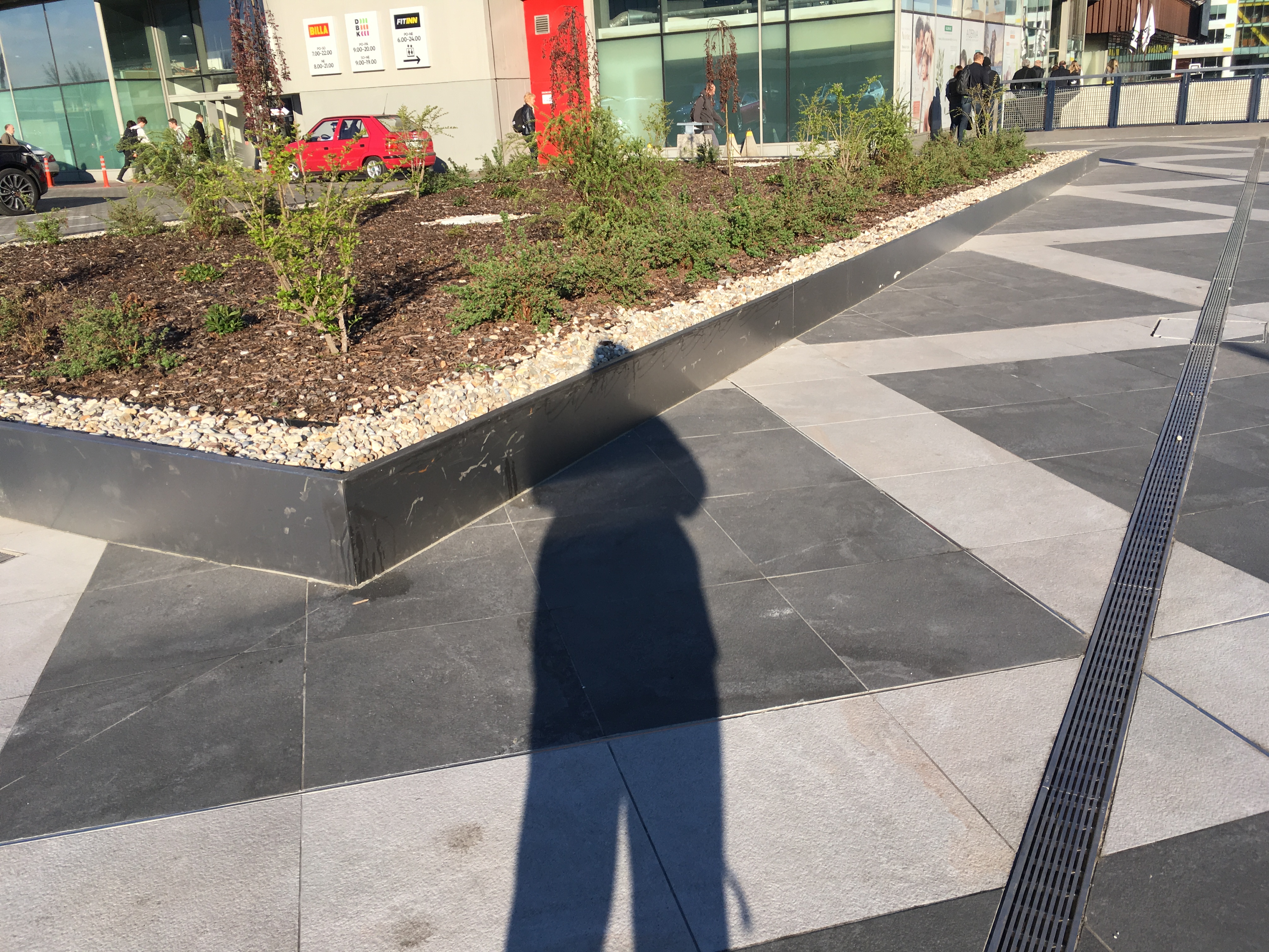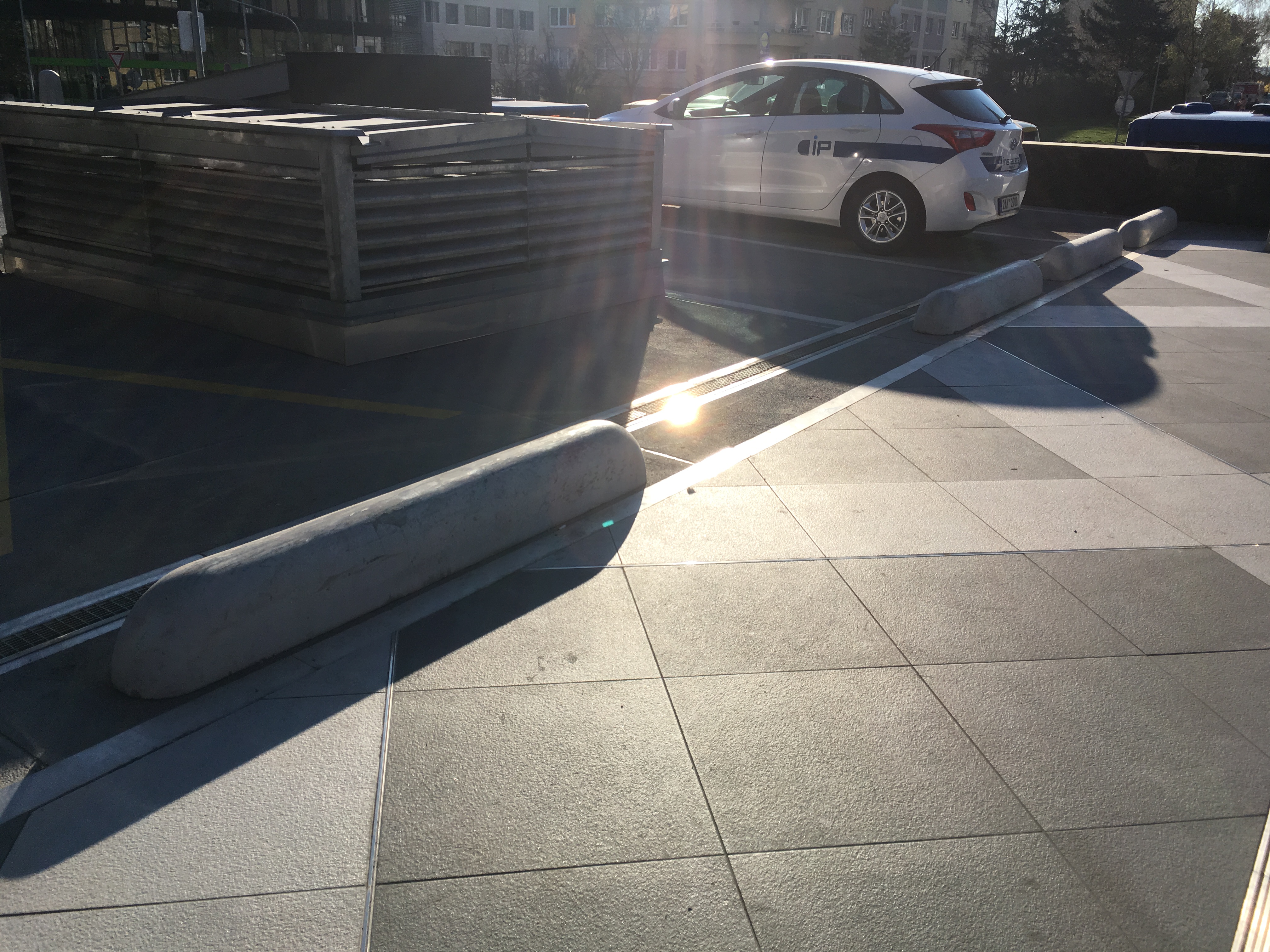 Před budovou směrem k hlavní silnici je stupňovitá mramorová zídka z obou stran a za budovou na parkovišti více než parádní parking curby a železné květináče. Prý se zatím nevyhazuje, navoskováno je…