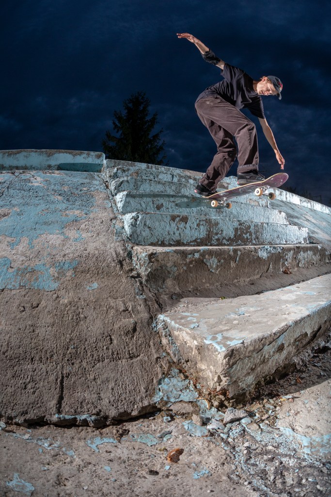 V podobnejch věcech jsme s klukama jezdili odjakživa, dávno před vznikem Darkslidu. Pamatuju si tu skvělou, teď už zasypanou nádrž na Vítkově, rádiusovou fontánu v Karlíně nebo ten bazének nad Andělem, kterej stále funguje a po letech sem tu znovu měl možnost udělat nový triky. Za mě je výběr spotu půl hodnoty záběru. Když se zadaří odjet kvalitní trik na neokoukanym místě, je to nejvíc. V Dry season navíc byl ten prvek dobrodružství, přípravy spotu a radosti, že na danym místě jsme možná první skateři ever. Video vznikalo cca. dva roky a nejvíc mě na tom bavilo, že se při něm využili všichni členové týmu – jak starý páky, tak naše hlavní stars. Někdo přispěl zkušenostma, někdo prací s koštětem, někdo zandal trik, tenhle projekt hajpnul celou partu na 110%!