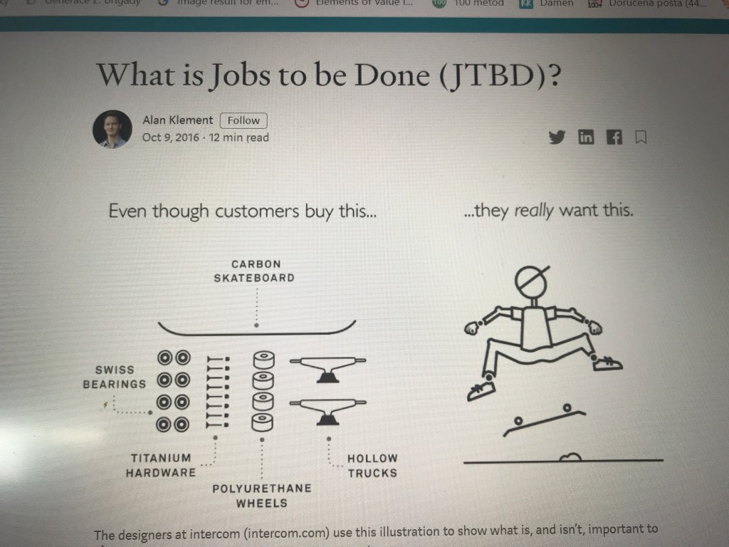 Zajímavá mi přišla taky ilustrace z článku o Job-to-be done teorii, která je inspirovaná mým životem: kupuju si karbonovýho skejta a keramický ložiska, abych udělal kino přes kamínek.